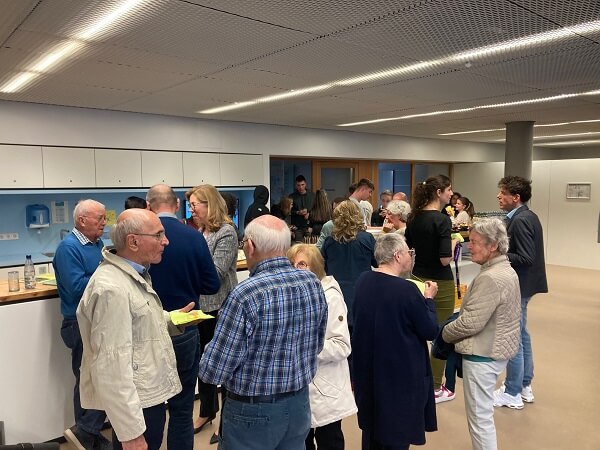 Nach den spannenden Erzählungen folgte die feierliche Eröffnung der begleitenden Ausstellung in den Räumlichkeiten des Jahrgangs 9. Sechs Zeitzeugen standen weiterhin für Gespräche zur Verfügung und die Jugendlichen nutzten diese einmalige Gelegenheit intensiv. Für das leibliche Wohl sorgte Frau Ohler mit ihrem WPU-Kurs aus Jahrgang 8 – besten Dank für das liebevoll zubereitete Fingerfood-Buffet, das den perfekten Rahmen für angeregte Gespräche bot.