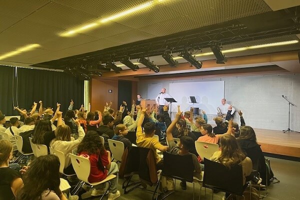 Groovig wurde es beim Stück „Elegy for Mippy II“ von L. Bernstein (1918 - 1990), bei dem Posaunist Roman Bozzetta seinen großen Soloauftritt hatte. Die Schülerinnen und Schüler stampften eifrig zum Beat und beim finalen Stück „Feeling Good“ wurde der Name zum Programm. Alles in allem war ein rundum gelungener Vormittag, der einen tollen Einblick in die Musik aus verschiedenen Jahrhunderten bot.