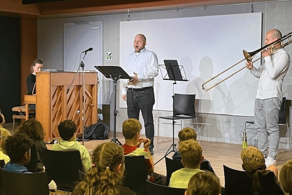 Bereits zum 4. Mal besuchte uns das Trio um Sänger und Erzähler Johannes Lehner im Auftrag der Internationalen Stiftung zur Förderung von Kultur und Zivilisation. Große Augen machten die Kinder bei Mozarts „Alla Turca“, meisterlich gespielt von Pianistin Kristina Ruge. Sie begeisterte die Kinder auch mit dem Stück „The River flows in You“ von Yiruma (*1978), welches vielen aus dem Film „Twilight“ bekannt ist. Doch nicht nur die musikalischen Beiträge faszinierten, sondern auch die spannend erzählten Anekdoten zu den Komponisten und den gesellschaftlichen Umständen, zu denen die Musik entstanden ist.