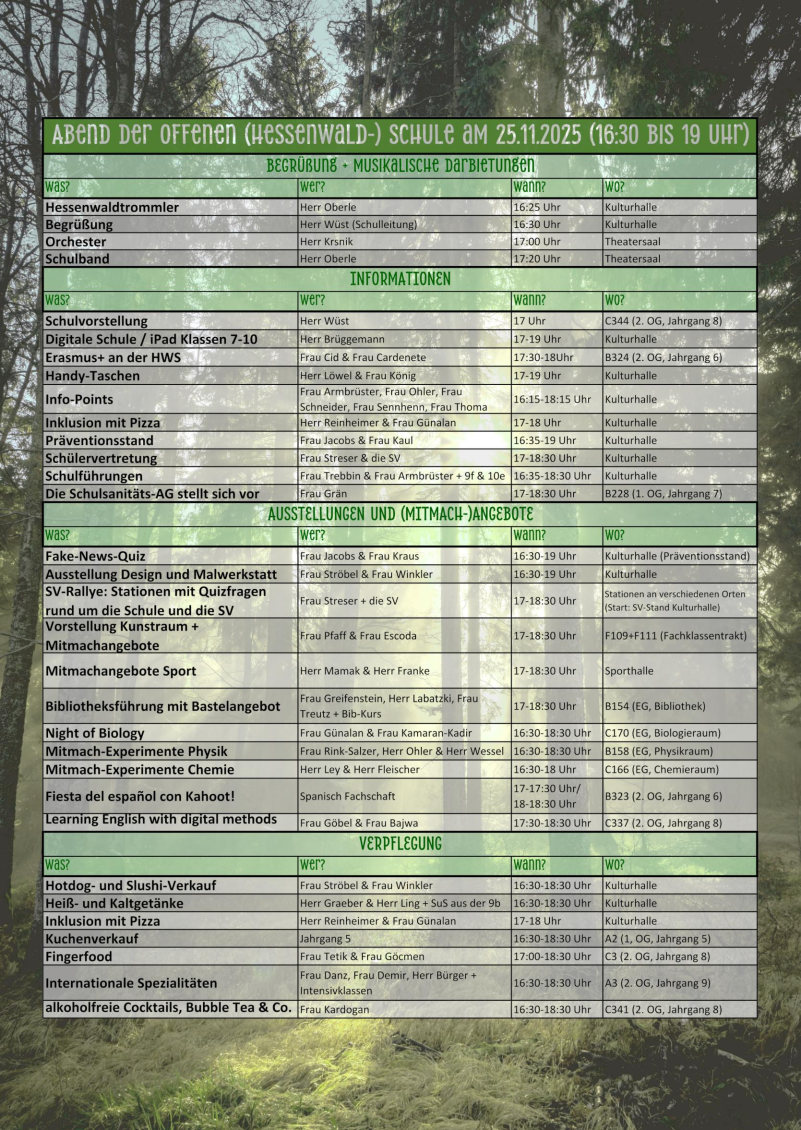 Ob digitaler Englischunterricht mit dem iPad, MINT-Experimente zum Mitmachen oder eine Schulrallye mit spannenden Quizfragen – Besucherinnen und Besucher können an diesem Abend selbst erleben, wie vielfältig und lebendig Lernen an der Hessenwaldschule gestaltet wird. Lehrkräfte, Mitarbeiterinnen und Mitarbeiter sowie Schülerinnen und Schüler präsentieren gemeinsam die besonderen Schwerpunkte, Angebote und Ausstattung der Schule.