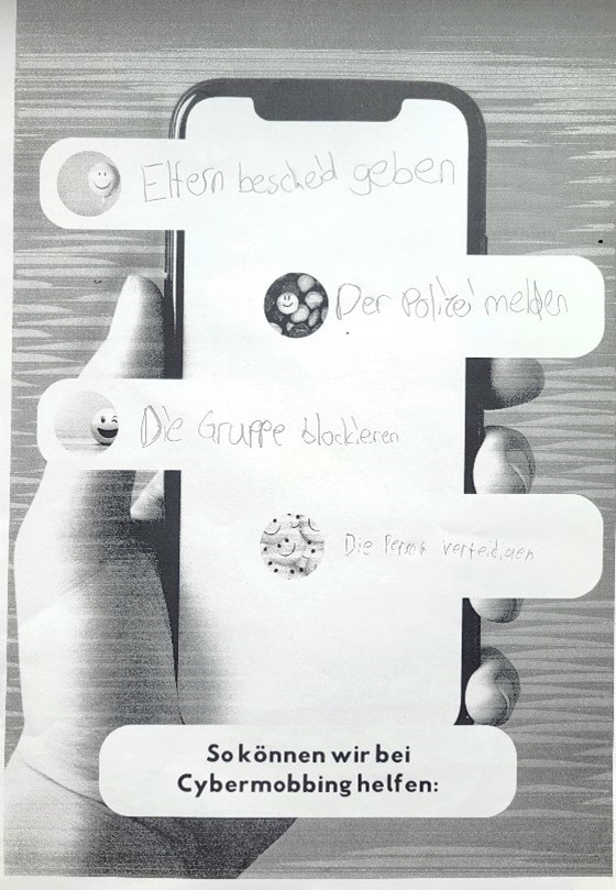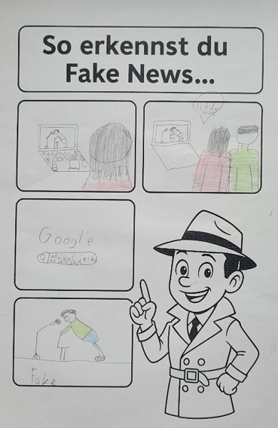 Besonders wichtig war, dass die Kinder nicht nur zuhören mussten, sondern in allen Stationen eigene Produkte gestalteten – vom Steckbrief über Chat-Regeln bis hin zu Plakaten und Comics. Diese Ergebnisse hängen nun in den Klassenräumen und erinnern die Schülerinnen und Schüler im Alltag an das Gelernte.