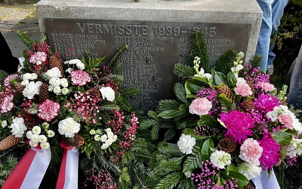 Zum Abschluss legten Schüler der 10d am Kriegerdenkmal im Kirchgarten einen Kranz nieder und setzten so ein sichtbares Zeichen des Erinnerns und des Friedens.